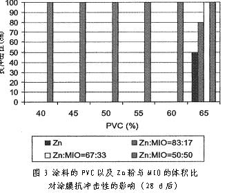 云母氧化鐵能顯著影響涂料的機械性能。含球狀鋅粉和云母氧化鐵組合的富鋅底漆具有很好的抗沖擊性 ( 見圖 3) 。但是隨著涂料中 PVC 從 40% 到 65% 的不斷提高,涂膜的杯突性能和柔韌性都會下降 ( 見圖 4 和圖 5) 。