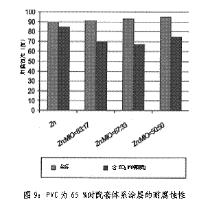 單底漆在含 SO 2 氣體的熱濕熱箱中進行的耐腐蝕試驗表明,當涂料的 PVC 為 40% 時,涂膜的屏蔽性主要由云母氧化鐵的屏蔽性決定;當涂料的 PVC 為 50% 時,涂膜的耐腐蝕等級達到 82 ;隨著涂料中 PVC 的逐漸增大,涂膜變得容易被滲透,耐腐蝕性也下降。