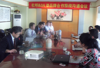 佛山市三愛化工有限公司參加本次會議的有總經理安彤書、品牌經理閆曉玲以及建筑涂料中心和采購中心的負責人。雙方就08年10月以來進行的品牌合作工作進行了深入的溝通并對下一階段的推廣工作進行了探討。