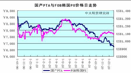 目前原油價(jià)格維持在90美元高位震蕩,成本支撐PX 現(xiàn)貨仍維持1097 美元/噸FOB 水平之上。12 月PX 合同報(bào)價(jià)前期在1200-1250 美元/噸產(chǎn)生,但PX 結(jié)算商談遲遲不能出臺(tái)PX 供應(yīng)商意向價(jià)位至少在1100美元/噸甚至以上,而PTA工廠所能接受的價(jià)格估計(jì)也就在1045-1080 美元/噸區(qū)間。PX 高結(jié)以及當(dāng)前PTA 自身已經(jīng)處在全年甚至近年來(lái)低位區(qū)間,或許已成為PTA看好的少數(shù)利好因素,但 2008年-2010 年,新增的PX 產(chǎn)能將超出PTA 產(chǎn)能需求量,那時(shí)PX 價(jià)格可能出現(xiàn)較大幅度下降。雖然PX 價(jià)格下降對(duì)于降低PTA生產(chǎn)成本是個(gè)利好,但整體而言在PTA 自身行業(yè)供大于求的事實(shí)面前,當(dāng)前終端需求的實(shí)質(zhì)性變化則是主宰后期行情變化的主要?jiǎng)右颍A(yù)計(jì)下周PX 價(jià)格將維持在1080 以上。
