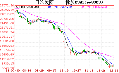 11 月份,上海天然橡膠期價在中上旬橫盤整理后,于下旬再次向下突破。中上旬,滬膠期價主要在13000-14000 元區間窄幅振蕩整理;東京膠則在160-200 日元區間振蕩。雖然在這期間原油價格持續下滑,且下喲仟疲軟,但東南亞主產國宣布減產,且中國連續出臺大規模刺激經濟措施,加之價格區間已經降至幾年來低位,使得膠價短期支撐較強,主要以橫盤整理為主。但進入下旬,全球經濟不斷惡化,各國采取的措施仍沒有快速見效。尤其,汽車產業受到了嚴重的沖擊,美國三大汽車巨頭瀕臨破產,并開始尋求美國政府幫助。膠價因此下破前期平臺支撐,進一步下行尋找新的支撐。