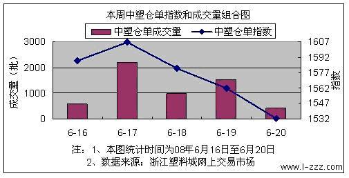 國際原油大幅震蕩,高位盤整,本周倉單市場行情整理回落,幅度較大,至周末,中國塑料價格指數大幅走低,震蕩回落。截止周五15時,中塑指數報收于1498.58點,較上周末下跌57.57點。累計總成交量為5716批,同比上周末增加996批;訂貨量為3419批,較上周末減少211批。
