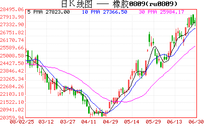 原油突破140美元,國際商品期貨市場大多數跟商品漲。TOCOM期膠小幅高開,空頭大舉增倉造成期價震蕩下行。較之日膠,滬膠開盤后短暫上揚即跟隨日膠下行,RU0809合約以27805元/噸報收。從持倉看,主力資金緩慢移倉,尾盤減倉明顯。