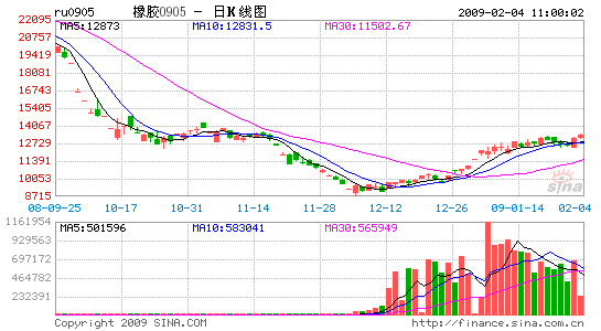 1月初,滬膠期貨價格延續反彈行情,主力905合約突破11000并接連拉3個漲停板,形成09年初少數幾個被交易所強行平倉的合約之一。1月中旬,天然橡膠大體維持震蕩整理、底部逐漸抬高的格局。由于臨近春節長假,這時期多空雙方均持謹慎態度,同時有部分投機頭寸削減頭寸,回避風險也使得這個時期的行情走勢出現劇烈震蕩,單邊走勢行情未出現。