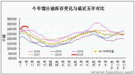 今年餾分油庫存變化與近五年對比圖。(來源:北京中期)