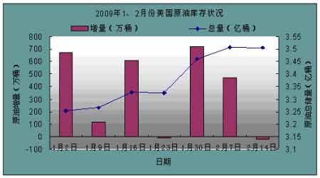進入2009年后,美國原油價格始終維持在33美元至52美元區(qū)間內(nèi)低位震蕩。最低點為1月15日的33.20美元。由于需求下降,美國商業(yè)原油庫存從2008年6月開始持續(xù)增加。截止到今年2月中旬已經(jīng)達到3.5億桶;謴(fù)到了2007年初水平,而與之伴隨的國際原油價格也已經(jīng)回到了2005年水平。在終端消費難以恢復(fù)狀態(tài)下,石化產(chǎn)品價格不斷降低,石化生產(chǎn)廠家利潤縮水甚至虧損,原油使用量不斷降低。庫存壓力增大。從下圖中可以看出,在1、2月份連續(xù)7周的時間里美國原油庫存僅有2周為減少,有5周為增加,其中有3周單周增幅超過了500萬桶,7周內(nèi)增加了近2500萬桶。