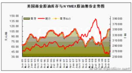 美國商業原油庫存與NYMEX原油期價走勢圖。(來源:北京中期)