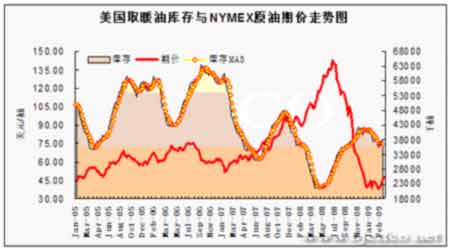美國取暖油庫存與NYMEX原油期價走勢圖。(來源:北京中期)