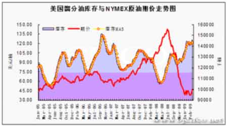 美國餾分油庫存與NYMEX原油期價走勢圖。(來源:北京中期)
