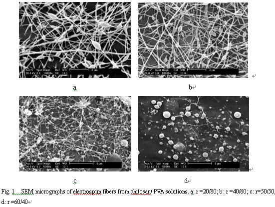 以2wt%乙酸為溶劑,配制殼聚糖( n =2.0´105, 脫乙酰度=90%)和PVA(醇解度=98%,聚合度 = 1750)的混和紡絲溶液,考查了共混溶液濃度c (wt%)、殼聚糖/ PVA的質量配比r、過程參數(靜電壓V、接收距離d、流速f)對溶液的可紡性及纖維形貌的影響。在配比r =50/50下,溶液濃度在4wt%時只能得到大量的珠滴,當濃度增大到6 wt %時則產生細小的纖維,濃度為7 wt %時,產生的纖維很多且直徑范圍小于100 nm, 而纖維中珠滴尺寸也有所變小。濃度再增大,紡絲不能進行。溶液的粘度和電導率都隨著濃度的增加而增加,適合紡絲的溶液粘度小于100 cP (Table 1)。