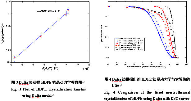 2)通過對HDPE在不同冷卻速度下結晶動力學的模擬值與DSC實驗值的比較,得到了兩種能描述聚合物在變溫熱歷史下的結晶動力學形式,即Dutta法和Nakamura法,發現Nakamura法的模擬值與實驗值具有更好的一致性。在Nakamura模型中,直接從HDPE的等速降溫DSC實驗上獲得了材料的結晶動力學參數,根據log[-log(1-X(t))]對logf(t) 作圖時與冷卻速度的無關性,找出了H-L方程中Kg的最佳值,進而確定了其它的動力學參數。