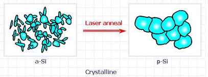 p-Si 與 a-Si的顯著區別是LTPS TFT在制造過程中應用了激光照射。LTPS制造過程中在a-Si層上進行了激光照射以使a-Si結晶。由于封裝過程中要在基板上完成多晶硅的轉化,LTPS必須利用激光的能量把非結晶硅轉化成多晶硅,這個過程叫做激光照射。