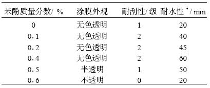 表 4   苯酚用量對(duì)乳液性能的影響  注 : 3 涂膜在沸水中無(wú)變化的時(shí)間