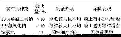 由表 6 可以看出 , 離子型緩沖劑磷酸二氫鈉溶液和氫氧化鈉溶液的緩沖效果不如共價(jià)型緩沖劑濃氨水的效果好 , 前兩者都會(huì)使乳液凝聚物增多。這可能是因?yàn)榻饘匐x子帶電 , 影響了乳液的電荷平衡 , 導(dǎo)致乳液的穩(wěn)定性下降 , 使乳液粒徑變大、凝塊量增加。