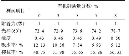 乳液聚合中加入有機硅氧烷進行改性 , 由于有機硅氧烷的交聯作用以及硅氧鍵的特殊化學性能 , 因此可以明顯改善乳液涂膜的性能。實驗中使用的有機硅氧烷為乙烯基三甲氧基乙氧基硅烷 , 不同有機硅用量 ( 質量分數 ) 對乳液及涂膜性能的影響見表 1 、 2 。