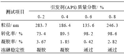 引發劑是乳液聚合配方中最重要的組分之一 , 它的種類和用量會直接影響產品的產量和質量 , 并影響聚合反應速率。試驗中采用的引發劑為過硫酸銨 , 不同引發劑用量對乳液的影響見表 3 。