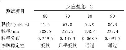 通過考察凝膠量 , 探討了聚合溫度對合成反應穩定性的影響 , 如圖 1 所示。綜合考慮 , 確定最佳反應溫度為 80 ℃ 。