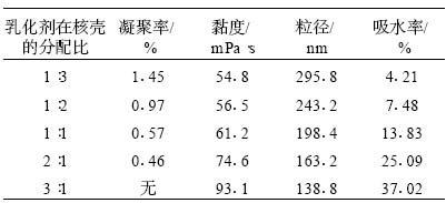 表 6   乳化劑在核殼內的分配比例對乳液穩定性以及涂膜吸水率的影響