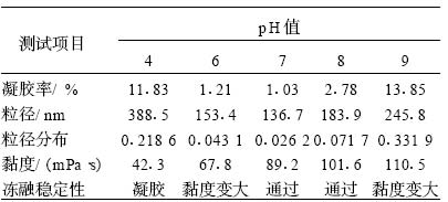 乳液的 p H 值增加 , 使羧基中和度提高 , 有利于提高羧基表面分布比例 , 降低乳液表面張力 , 從而提高乳膠粒靜電穩定性 , 減少凝聚率 , 提高聚合過程穩定性和乳液的凍融穩定性。如果乳液的 p H 值過高 , 會使離子強度增加過多 , 電解質效應使離子發生凝聚 , 降低聚合穩定性。同時在不合適的 pH 值條件下因有機硅氧烷的水解和縮聚過大 , 也會引起乳膠粒的凝聚 , 降低乳液的聚合穩定性。由表 7 可以看出 , 合成乳液體系的 pH 值在 7 ~ 8 之間時 , 乳液穩定性較好。