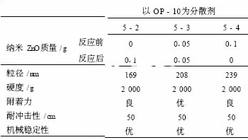 表 5 以丙烯酸和油酸為功能單體 , 研究分散劑對納米 ZnO 復合乳液及涂膜性能的影響。