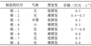 由以上實驗結果 , 相 - 1 、相 - 2 、相 - 3 均具有滿意的相容性 , 但考慮到相 - 1 氣味較大 , 存在環境污染問題 , 不予采用。相 - 2 的初始相容性和增塑相容性均優 , 優先采用。綜合考慮價格因素 , 也需少量使用相 - 3 以調節成本。