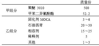 甲組分 ( 預聚體 ) 配方 : 用混合聚醚 ( 端— OH 基 ) 與甲苯二異氰酸酯 ( TD I) 合成 , 在混合聚醚中 , 以 330 聚醚 ( 相對分子質量 3000, 官能度為 3) 為主 , 采用一定量的低相對分子質量二官能度聚醚以調節硬段含量及官能度 ( 相對分子質量 400, 官能度為 2) 。聚醚 3010 石油瀝青的填入量在允許的情況下盡可能大 , 最多可達 50% ( 質量分數以乙組分計 , 下同 ) , 用效果較好的相容劑相 - 3, 其加入量受飽和相容量的限制 , 同時考慮到價格、成本等因素 , 在能滿足初始相容性的情況下 , 應盡可能少用 , 根據澆樣實驗 , 用量在 30% ~ 40% 為宜 ; 稀釋劑的加入是為了調節黏度 , 用量在 3% ~ 7% , 冬、夏季節溫差大 , 物料稠度各異 , 因此 , 其用量隨季節不同而有所調整 ; 固化劑的用量需根據甲組分的— NCO 含量不同而改變 , 用量在 5% ~ 10% 范圍內即可使強度和延伸率達到最佳值。