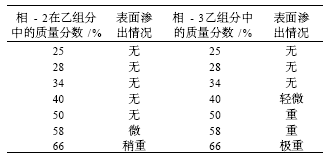 在確定相容劑的用量時 , 首先要考慮相容劑的加入量必須要使乙組分具有足夠低的黏度 , 其次還應考慮其用量不宜過大而使固化物的表面產生滲出。相容劑種類不同 , 增塑相容性會有不同 , 特定數量預聚體經固化后所能包容而不發生滲出的臨界加入量 ( 飽和相容量 ) 亦有所差異 , 在擬訂乙組分配方中相容劑的用量時 , 飽和相容量是一個重要的參考數據 , 為此 , 根據澆樣實驗結果得相 - 2 和相 - 3 的飽和相容量的值。