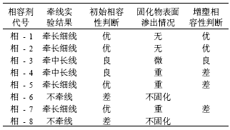 利用牽線實驗觀察初始相容性 , 通過表面沾污性的觀察評價增塑相容性 , 其結果如表 4 所列。