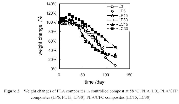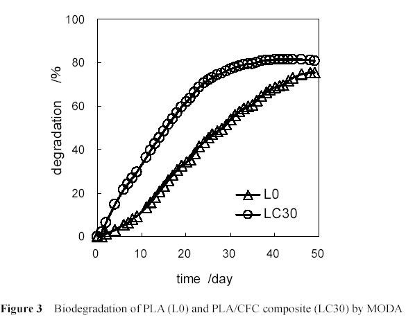 通過我們最新方法制備了聚乳酸(PLA)纖維素纖維(CF)可生物降解聚合物復(fù)合材料。在簡單的塑料管中,以三氟甲基磺酸鋁為催化劑,丙三醇為引發(fā)劑,CF作為填充劑進行L-乳酸(LA)的開環(huán)聚合反應(yīng),于100°C下反應(yīng)6小時。通過這種方法CF可以很容易和均勻地與聚合物體系混合。凝膠滲透色譜(GPC)測定PLA的分子量和分子量分布表明復(fù)合物試樣的Mn隨CF含量的增加從6200降至2800。復(fù)合物分子量分布在2.5左右且不受CF含量的影響。復(fù)合物試樣的表觀密度通過計算柱形試樣的重量和大小得到。試樣的生物降解性研究采用微生物氧化降解分析(MODA)和堆肥失重測定。MODA測定表明,復(fù)合物試樣的生物降解性隨CF含量的增加而增加。復(fù)合物試樣的密度較不含有CF的純PLA略低。通過抗壓試驗研究了柱形試樣的彈性模量和強度等機械性能。結(jié)果表明對于有CF濾紙的試樣,復(fù)合物試樣的強度隨CF含量增加而增加。