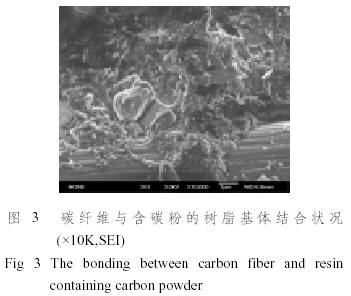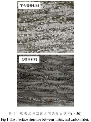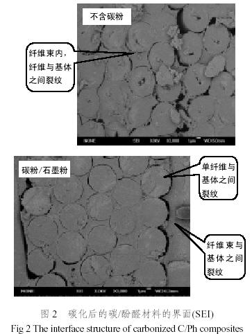 由圖1可見,不含碳粉體系的碳/酚醛材料中基體樹脂內(nèi)部氣孔很多,且大小不一,有的氣孔穿透酚醛樹脂基體層,到達(dá)碳布層的表面。所有這些缺陷將導(dǎo)致復(fù)合材料的層間性能的下降。而含碳粉體系內(nèi)基體部分致密,微米尺度氣孔明顯少,樹脂基體與碳布層結(jié)合緊密。