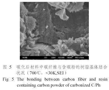 碳/酚醛材料經(jīng)過700℃碳化后,微觀結(jié)構(gòu)見圖2,由圖2可知,不含碳粉組的材料雖沒有出現(xiàn)明顯的布層與基體之間界面層分層,但是微米級的裂紋明顯多于含碳粉組材料的裂紋,截?cái)嗝嬗写罅棵撀錁渲w碳碎片,且碳纖維束中的碳纖維之間脫粘嚴(yán)重、纖維之間松散,形成了單根纖維,材料承載能力和抗沖刷能力下降。含碳粉組材料的布層與基體之間雖出現(xiàn)局部脫粘,但是截?cái)嗝嫫秸w維之間結(jié)合相對緊密,同時(shí)可看出纖維束內(nèi)部的纖維與基體之間的裂縫明顯小于纖維束與層間基體之間的裂縫,有利于提高材料的界面性能。