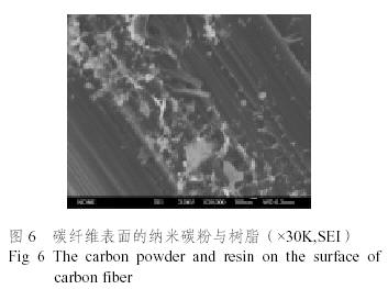 在2000倍下,纖維與纖維之間存在大量的含碳粉的樹脂基體,基體與碳纖維結(jié)合良好;在10000倍下(圖3),碳纖維表面存有大量的納米碳粉(含樹脂)的顆粒。圖4為碳化后的單根碳纖維表面狀態(tài),由圖4可知,樹脂基體脫落后,碳纖維表面殘存了大量的納米碳粉粒子。圖5為700℃碳化后纖維與樹脂基體的結(jié)合狀態(tài),可見樹脂基體與碳纖維之間間隙非常小。進(jìn)一步對碳化后材料中碳纖維表面進(jìn)行分析,結(jié)果見圖6,從圖6可發(fā)現(xiàn),大量不同粒徑的納米碳粉粒子與樹脂基體滲入碳纖維表面的溝槽中,增大了碳纖維表面積,提高表面活性,同時(shí)可看出纖維表面存在明顯的樹脂剪切拉伸斷裂帶。圖7為700℃碳化纖維與基體的界面結(jié)合狀態(tài),從圖7 可看出,不含碳粉體系的纖維與樹脂之間在碳化后的界面間隙一般達(dá)到200nm以上,而含碳粉體系纖維與樹脂之間在碳化后的界面間隙一般比較低,在100nm以下,同時(shí)由于碳化中界面的作用力,碳纖維出現(xiàn)開裂情況,纖維與樹脂的斷裂面出現(xiàn)不規(guī)則的形狀,樹脂突起部分與纖維表面的溝槽相一致,形成了鑲嵌結(jié)構(gòu),而純樹脂體系的界面斷裂面光滑。這一結(jié)果表明,納米碳粉對碳纖維有很好的親和性,纖維與基體的界面所存在的大量納米粉體粒子對材料層間性能與纖維方向壓縮強(qiáng)度的提高能起到有利的作用。