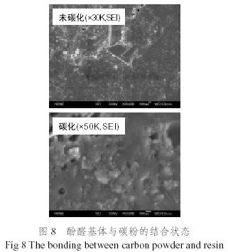 對納米碳粉與酚醛樹脂之間結(jié)合狀態(tài)進(jìn)行了分析,圖8為酚醛樹脂基體與碳粉的結(jié)合狀態(tài);圖9為碳粉對碳化后酚醛樹脂基體的影響。由圖8可發(fā)現(xiàn),納米碳粉與樹脂基體結(jié)合緊密;由圖9可知,含碳粉材料碳化后內(nèi)部氣孔相對較大且較多,形成了大量的納米級的球形空洞,納米碳粉粒子約束了樹脂基體的碳化收縮,樹脂基體開裂情況比較少。而不含碳粉體系的基體內(nèi)部也有碳化后的氣孔,但是數(shù)量比較少,同時(shí)可看出氣孔呈現(xiàn)不規(guī)則的扁孔形狀,這可能是樹脂碳化收縮產(chǎn)生應(yīng)力而變形所致。