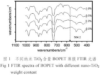 圖1為不同納米TiO2含量的BOPET薄膜的FTIR圖譜,由圖可見(jiàn),與空白試樣,即大有光PET相比,PET/納米TiO2復(fù)合薄膜在564.2cm-1處出現(xiàn)了一個(gè)新的特征吸收峰,而且隨著納米TiO2含量的增加,該峰有增強(qiáng)的趨勢(shì),該特征吸收峰為TiO2的Ti—O—Ti特征吸收峰。
