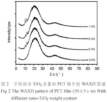 圖2為不同納米TiO2含量的PET鑄片的WAXD圖譜,由圖可見(jiàn),PET的特征結(jié)晶峰除1-05(2θ=43.3o)晶面外,在2θ角15~26°范圍內(nèi)010晶面、1-10晶面和100晶面的衍射峰相互重疊,呈饅頭化,但該饅頭峰又有相當(dāng)?shù)膹?qiáng)度,這表明PET樹脂在經(jīng)螺桿擠出鑄片成型時(shí)即部分結(jié)晶。經(jīng)雙向等倍拉伸后,因?yàn)槿∠蛘T導(dǎo)結(jié)晶,PET薄膜形成了比較完善的結(jié)晶結(jié)構(gòu),晶面1-10(2θ=22.6°)和100(2θ=25.4°)晶面的特征衍射峰相對(duì)強(qiáng)度增大,見(jiàn)圖4。與空白PET鑄片相比,在2θ=8.23°、10.32°、12.06°出現(xiàn)了3個(gè)尖銳的無(wú)機(jī)顆粒所有的衍射峰,這是由原位生成的納米TiO2所致。