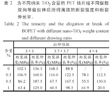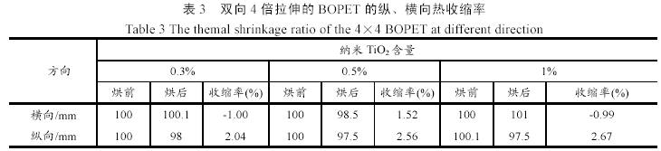 表3為雙向4倍拉伸的BOPET的熱收縮性能。由表可見(jiàn),在經(jīng)150℃下15min熱處理后,引入納米TiO2的BOPET其縱向的收縮率在2%~3%,橫向收縮率在±1.5%,與普通BOPET的熱收縮性能基本相當(dāng)。