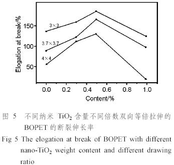 表2為不同納米TiO2含量的PET鑄片經(jīng)不同倍數(shù)雙向等倍拉伸后所得薄膜的斷裂強(qiáng)度和斷裂伸長(zhǎng)率,圖4和圖5分別為薄膜斷裂強(qiáng)度和斷裂伸長(zhǎng)率與納米TiO2含量的關(guān)系曲線。由表2、圖4和圖5可見(jiàn):