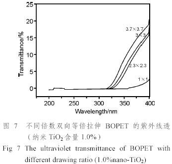 圖6和圖7分別為不同納米TiO2含量的BOPET和納米TiO2含量為1%的不同倍數(shù)拉伸的BOPET在不同波長(zhǎng)的紫外線透過(guò)率。由圖6可見(jiàn),在PET基體中引入納米TiO2后,PET在290~400 nm的范圍內(nèi)的紫外線透過(guò)率顯著降低,即其紫外線屏蔽功能明顯增強(qiáng)。隨著納米TiO2含量的增加,相應(yīng)薄膜的紫外線透過(guò)率呈減小趨勢(shì)。由圖7可見(jiàn),隨著薄膜厚度的增加,其紫外線透過(guò)率,在290~400nm的范圍內(nèi)基本呈線性減小趨勢(shì),這與薄膜厚度和單位面積內(nèi)納米TiO2濃度密切相關(guān)。當(dāng)薄膜厚度達(dá)(30±5)μm時(shí),納米TiO2含量為1.0%的薄膜,其紫外線屏蔽率已能達(dá)到97%(紫外線透過(guò)率在400 nm時(shí)最大,為2.86%)以上。