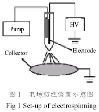 聚丙烯腈(PAN)粉末與N, N-二甲基甲酰胺(DMF)是Aldrich公司的商業產品,以DMF為溶劑配制PAN溶液,其濃度分別為6%(質量分數)、8%(質量分數)、10%(質量分數)和12%(質量分數)用于電場紡絲。聚合物溶液在高壓直流電源的作用下,克服表面張力,形成噴射細流,在噴射過程中,溶劑不斷揮發,射流的不穩定性和靜電力的作用使射流不斷被拉伸,有時會發生射流分裂現象,最終在收集器(鋁箔)上得到直徑為幾十納米到幾微米的纖維,其裝置見圖1。毛細管末端與收集器之間的距離為10cm,電場紡絲電壓為10~20kV。