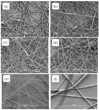圖2是不同紡絲條件下所得到的纖維形貌,從圖可知,隨著聚合物濃度的增加,纖維的直徑不斷增大,并且在較低的濃度下,纖維上有鏈珠狀結構出現(見圖2a),隨著電壓的增大,該鏈珠狀結構變成梭狀結構(見圖2b, 2c),這與Reneker等[17]的研究結果一致,但電壓的增加對纖維的直徑影響并不大。