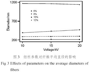 為了研究紡絲參數對PAN原絲平均直徑的影響,采用了因子試驗方法,選溶液濃度及所施加的電壓兩個因子,溶液濃度有4個水平,分別為6%、8%、10%及12%(質量分數);施加的電壓有3個水平,分別為10、15及20kV。