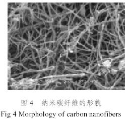 圖4為濃度為10%(質量分數)的溶液在20 kV下得到的納米PAN原絲經碳化后所得到的納米碳纖維,由圖可見碳纖維的纖維直徑在80~500nm之間,平均直徑約為380nm,比相同條件下的PAN原絲直徑約小20%,這是因為在碳化過程中體積收縮的原因。由電場紡絲方法制得的納米碳纖維直徑較小,并且可以具有三維連續的結構,在復合材料領域有潛在的應用前景。