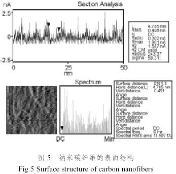 碳纖維的表面結構對其性能及在復合材料中的結合狀況有極其重要的影響,常規碳纖維屬于過渡形式碳的一種,其微結構基元類似石墨。理想的石墨結晶具有層狀晶格,屬于六方晶系。而碳纖維則只是層平面與石墨相同,但層面的排列并不規整,缺乏三維有序,屬于亂層石墨結構,且層間距比石墨晶體(d=0.3354nm)大。納米碳纖維因尺寸上的限制,其結構的形成過程與常規碳纖維可能有差異,對納米碳纖維原子尺度上的結構分析的報道并不多見,Endo等[18]用STM研究了氣相生長制得的直徑為100nm碳纖維的原子尺度上的結構,其結果表明:即使經過3000℃的高溫石墨化,由于碳原子六邊形的變形,點陣缺陷仍然存在。有關電場紡絲制備納米碳纖維的原子尺度上的結構研究尚未見報道,本實驗試圖得到電場紡絲制得的納米碳纖維原子尺度上的結構,但因所用探針直徑較大,或因為纖維碳化不完善等原因,并未能獲得原子尺度的圖像,但從圖5的研究結果可以看出納米碳纖維表面有長度約為10nm左右,寬度約為5nm沿纖維方向取向的凹坑,該結構有利于進一步增加纖維的比表面積和吸附性能,該類纖維在復合材料領域有潛在的應用前景。有關電場紡絲制得的納米碳纖維原子尺度上的結構還有待于進一步研究。