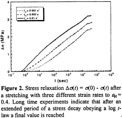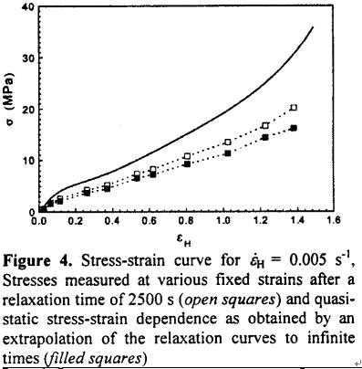 In stress relaxation experiments the sample was stretched at a constant strain rate to a certain strain. Then, keeping the strain fixed, stress was allowed to relax. Stress relaxation followed a logarithmic time-law until a final value was reached. The total amount of relaxed stress represents the contribution of the viscous stress. A subtraction of the viscous stress from the measured stress yields the true stress-true strain relationship which would be obtained in the limit of zero strain rate. This "quasi-static" stress-strain dependence includes the contribution of the , amorphous network and the stress transferred by the skeleton of crystals.