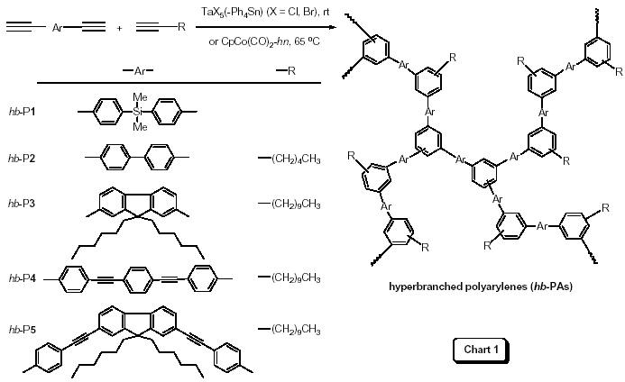 Abstract : π-Conjugated polymers are of much current academic and significant technological interest due to their many potential optical and electronic applications [1]. The frontier of conjugated polymer research is moving from linear to dendritic or hyperbranched structures [2–3]. In this work, a number of hyperbranched polyarylenes (hb-PAs) are synthesized by transition metal-catalyzed polycyclotrimerizations of aromatic diynes. This kind of [2 + 2 + 2] polycycloaddition reaction is carried out smoothly with one-pot, single-step procedure, giving soluble hb-PAs of high molecular weights (Mw up to ~2 × 105) in high isolation yields (up to ~100%). Chart 1 gives some examples of hb-PAs with varying aromatic rings and functional groups [4].