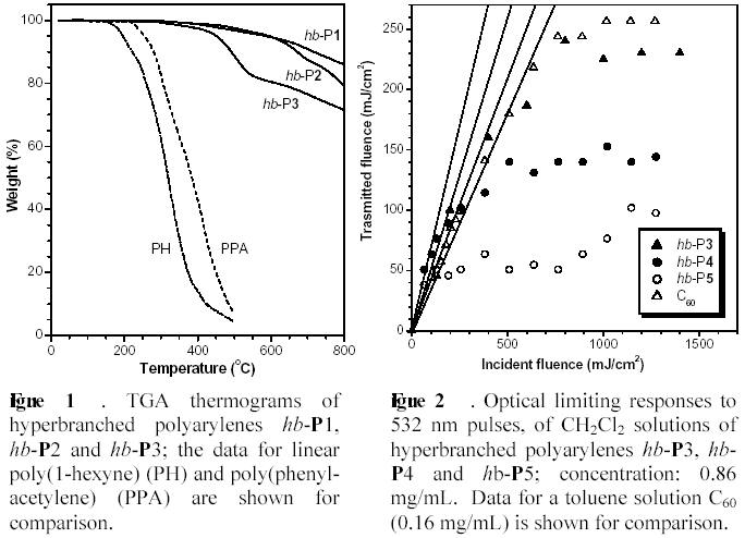 The hb-PAs are aromatic macromolecules and may serve as good optical limiters [6]. As shown in Figure 2 , the hb-PAs effectively attenuate the power of intense 532 nm laser pulses. Their optical limiting threshold (FL) and signal suppression (Ft,m/Fi,m) are superior to those of C60, a well-known optical limiter [7]. In addition, the optical limiting performance of hb-PAs is sensitive to a change in its molecular structure, offering the opportunity to tune its optical limiting properties through molecular engineering endeavors.