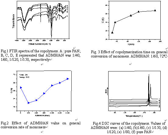 Fig.3是單體轉化率隨反應時間的變化情況。可見,一開始單體轉化率迅速增加,然后增勢趨于平緩。從Fig.4可看出,共聚物的分解或者環化溫度比純聚丙烯腈的低,而隨單體中ADMH含量的變化而沒有大的差別。