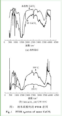 采用X(S)K160型開煉機(jī)進(jìn)行生膠的塑煉及與各種配合劑的混煉;采用UR2030型硫化儀測(cè)定正硫化時(shí)間;采用25t平板硫化機(jī)進(jìn)行試樣的硫化,硫化溫度為150℃.1.3 測(cè)試與表征傅立葉變換紅外光譜(FTIR)研究采用美國(guó)NicoletMEGNA_IR760型紅外光譜儀,試樣與溴化鉀混合研磨后壓片;熱重分析(TGA)分析采用美國(guó)TA公司TGA2050型熱重分析儀,氮?dú)獗Wo(hù),升溫速率10℃/min;掃描電鏡(SEM)研究采用德國(guó)里奧公司LEO1530VP掃描電鏡,納米碳酸鈣表面和硫化膠斷面鍍金;硫化膠交聯(lián)密度(Vr)采用平衡溶脹法測(cè)定,溶劑為正己烷;硫化膠各項(xiàng)力學(xué)性能均按有關(guān)的中國(guó)國(guó)家標(biāo)準(zhǔn)進(jìn)行測(cè)定.