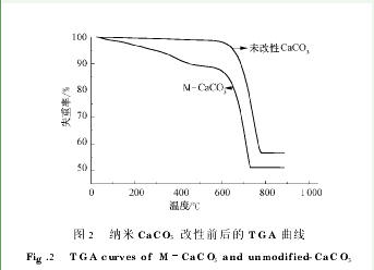 圖2的TGA曲線表明,未改性的CaCO3加熱至620℃才開始失重,分解為CaO和CO2,最大失重溫度751℃;MCaCO3有兩個(gè)失重臺(tái)階:第一次失重起始溫度為200℃,最大失重溫度381℃,為有機(jī)改性劑的分解;第二次失重起始溫度為559℃,最大失重溫度714℃,為CaCO3的分解.這是由于有機(jī)改性劑的引入使CaCO3的表面結(jié)構(gòu)發(fā)生了變化,促進(jìn)了納米碳酸鈣的分解所致.