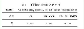 表1所列為交聯(lián)密度測(cè)定結(jié)果.從表中可看出,NR/MCaCO3納米復(fù)合材料的交聯(lián)密度顯著高于NR和NR/CCR體系,說明MCaCO3參與了交聯(lián)反應(yīng),從而使NR/M-CaCO3納米復(fù)合材料交聯(lián)密度增加.